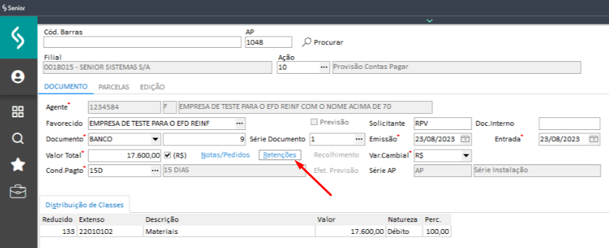 Após a alteração, para devida integração dos impostos IR, PIS, COFINS e CSLL para o módulo do REINF, é necessário preenchimento do novo campo Código de Natureza de Rendimento, localizado no botão Retenções da rotina Contas a Pagar: