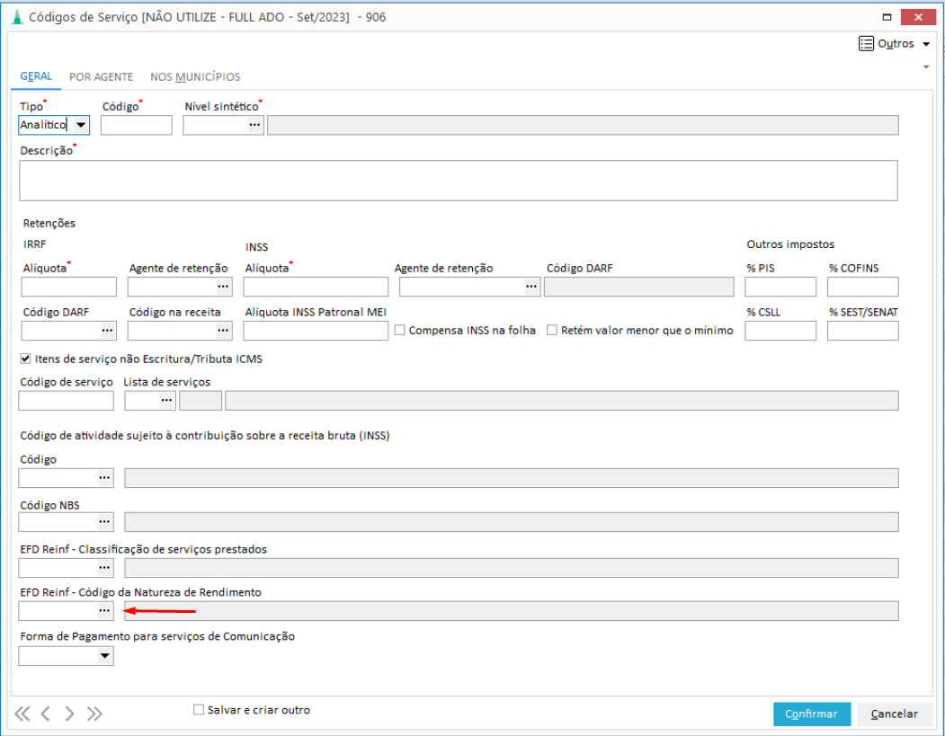 Inserindo valor nesse novo campo 'EFD-Reinf - Código da Natureza de Rendimento', os lançamentos de Notas Fiscais de Entrada que possuírem o código de serviço, enviarão também o Código de Natureza de Rendimento para o Contas a Pagar no Financeiro: