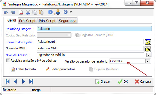 2. Identifique o campo Versão do gerador de relatório e altere o conteúdo do mesmo de Crystal 8/8.5 para Crystal XI, conforme imagem a seguir