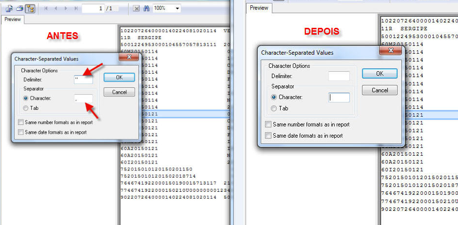 Campos Delimiter e Separator preenchidos: