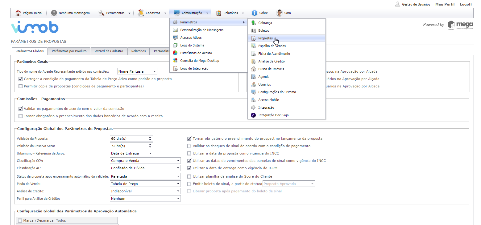 1. Acesse o Portal de Vendas com Perfil Administrador / Administração / Parâmetros / Propostas: