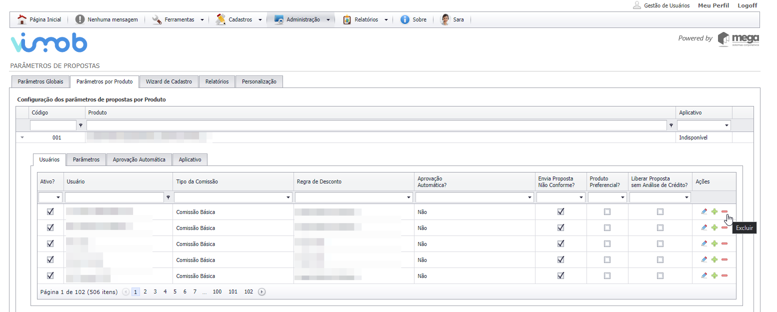 2. Na aba Parâmetros por Produto, localize o empreendimento que o usuário não deve ter acesso;