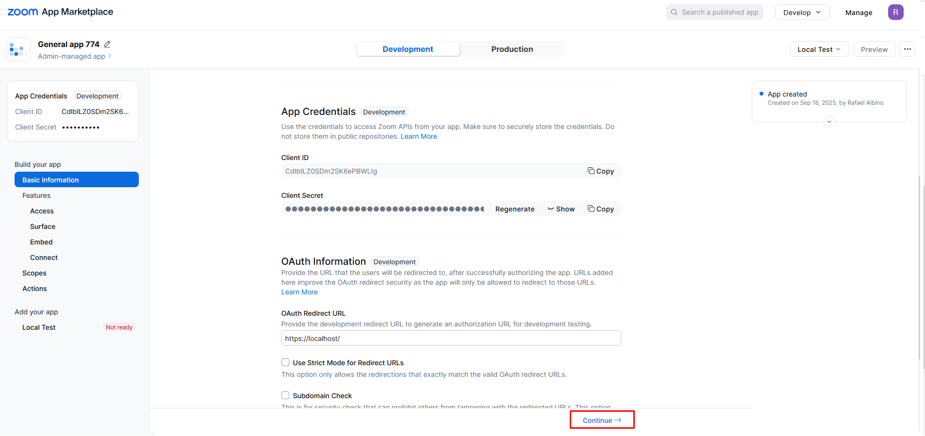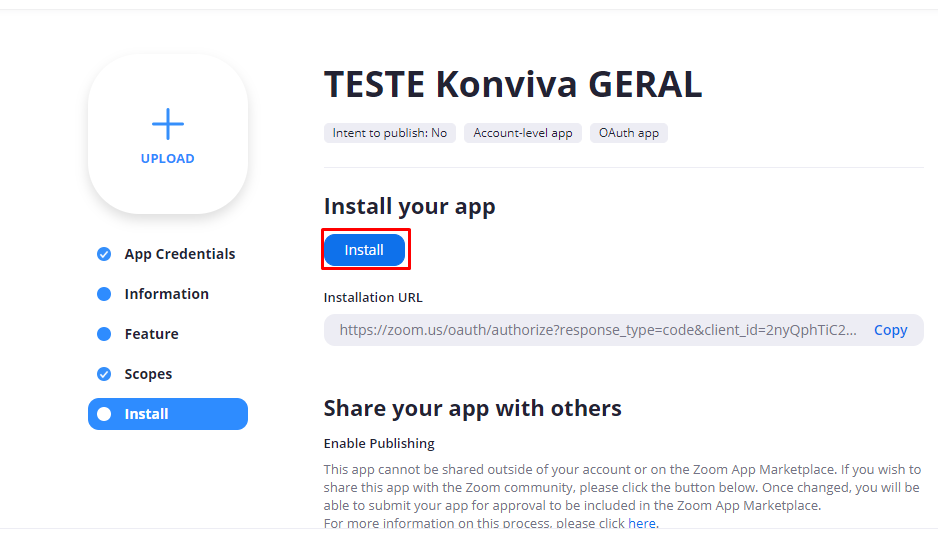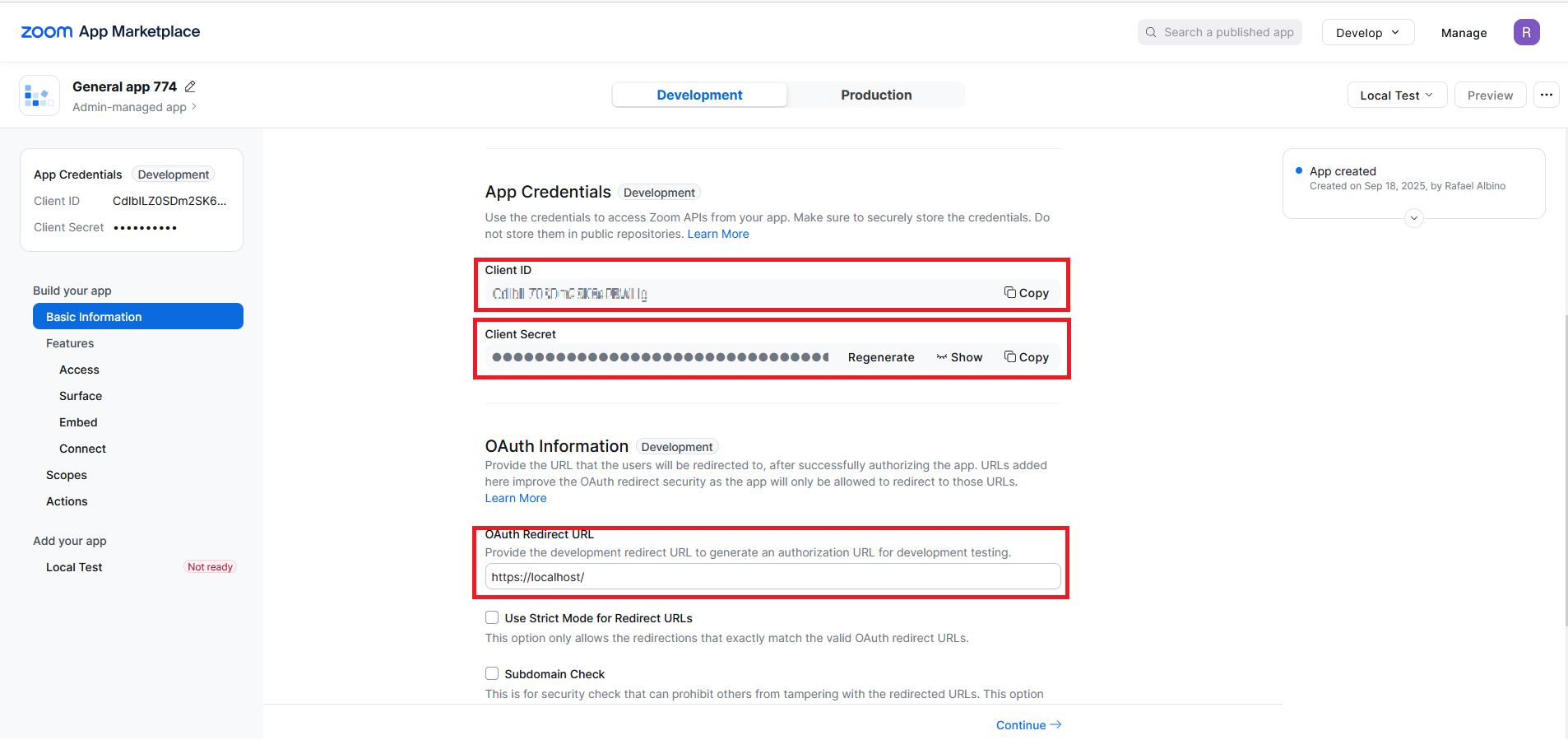 Logo à diante, será exibida uma tela com o Client ID, Client Secret (informações necessárias para incluir no configurador geral na Konviva) e solicitando para você inserir o OAuth Redirect URL, que deve ser atribuída como "https://localhost" (assim como deverá ser preenchido também no configurador geral do LMS):
