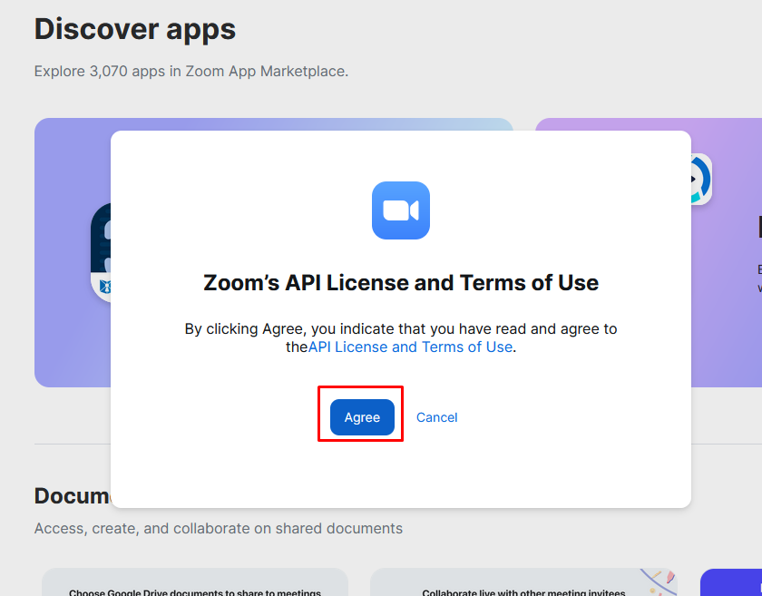 Após clicar em Build App, será exibido uma tela solicitando para você aceitar os termos de licença de uso da API do ZOOM conforme a imagem abaixo: