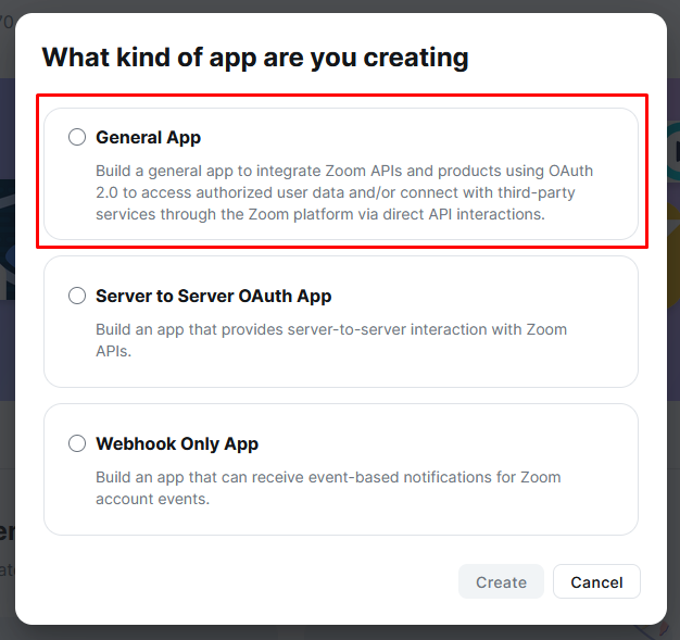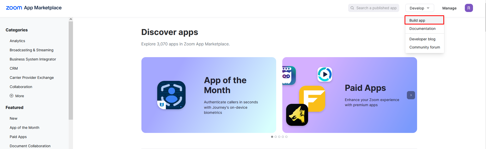 Para isso acesse a URL: https://marketplace.zoom.us/develop/create e vá até o menu "Develop > Build App" conforme a imagem: