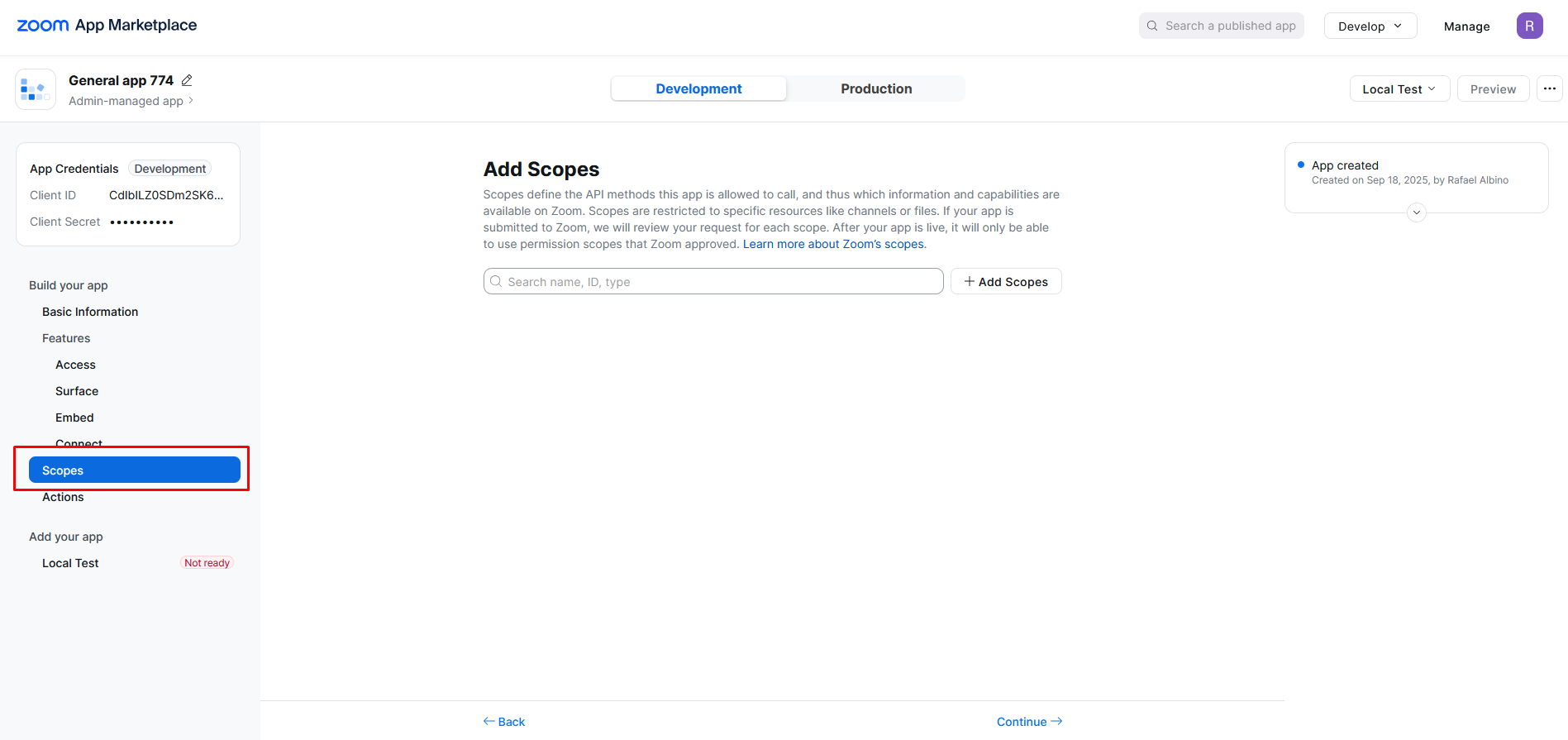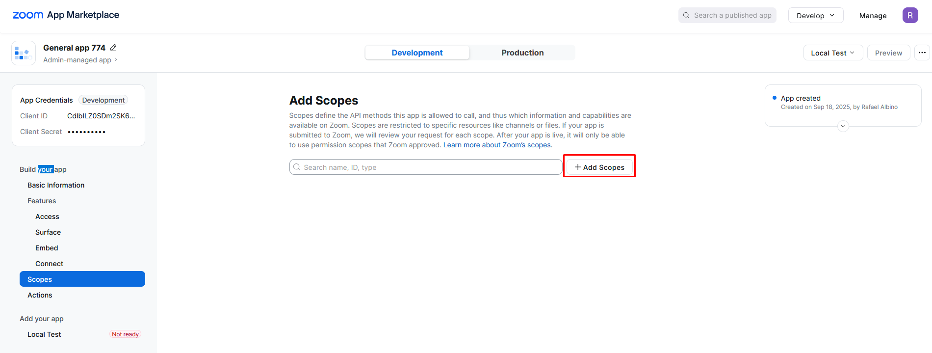 Agora clique em "+ Add Scopes" conforme a imagem: