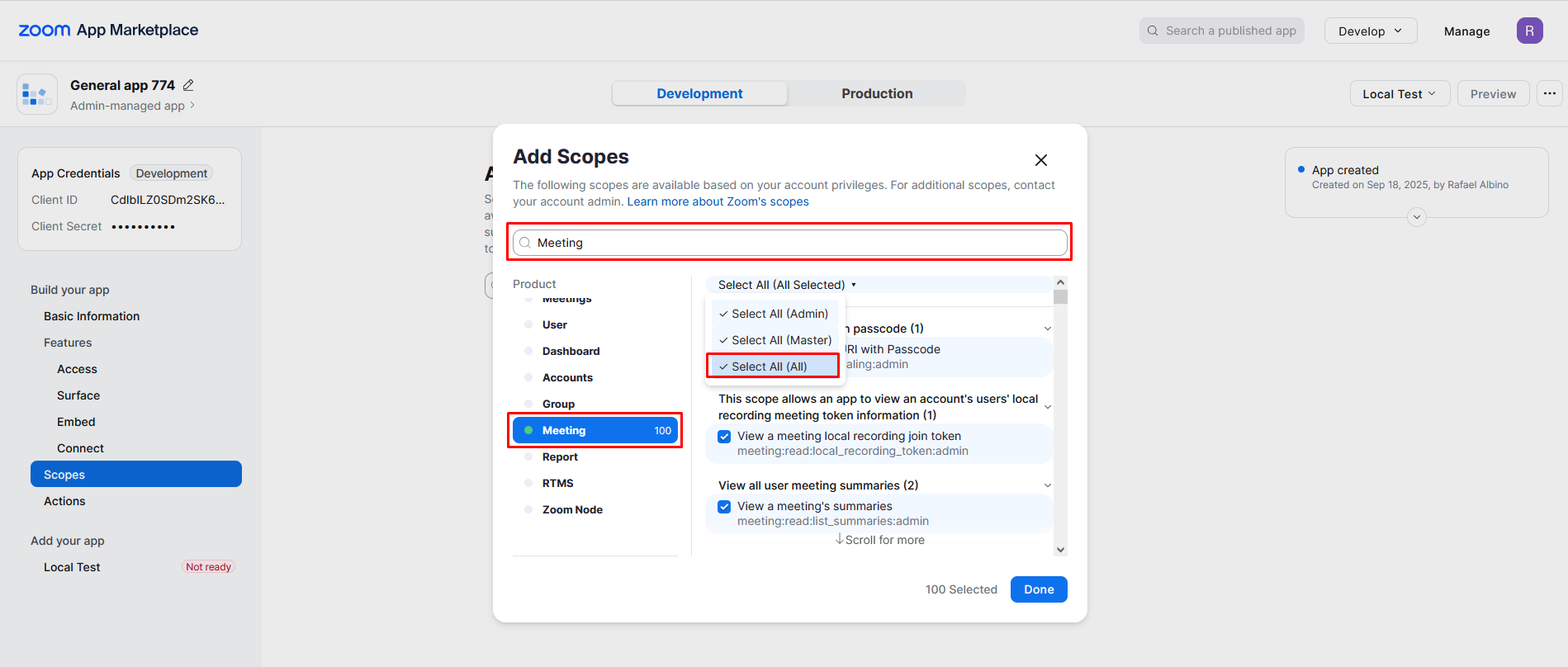 Na tela que será aparecer você deverá procurar por "Meeting" e na lista de produto selecionar "Meeting", depois clique em "Select All (All)" conforme a imagem:
