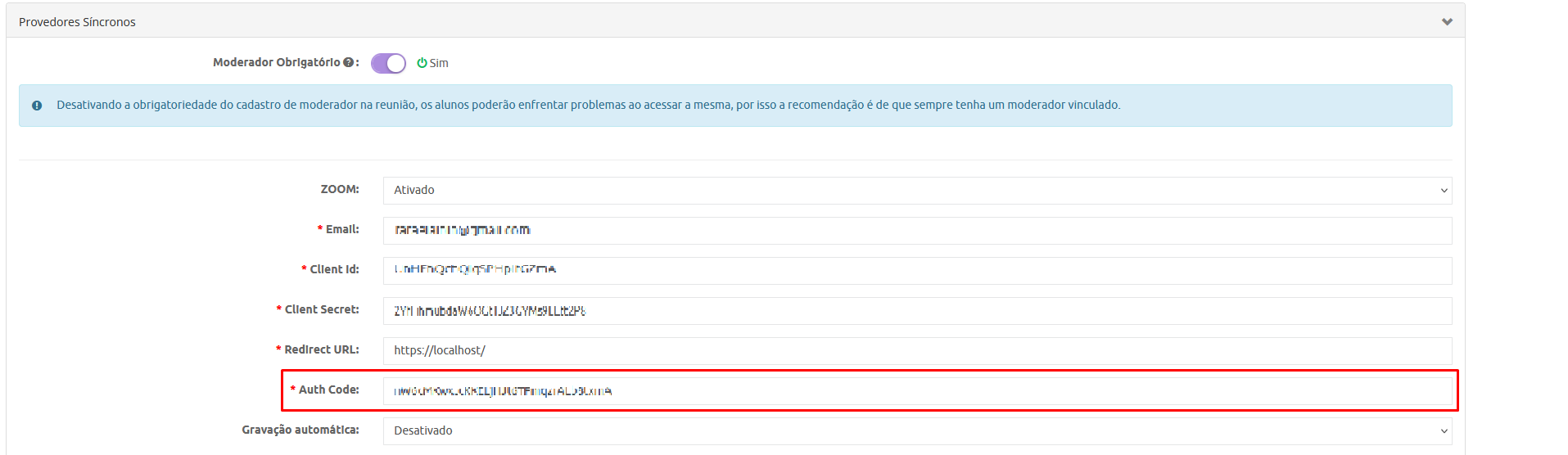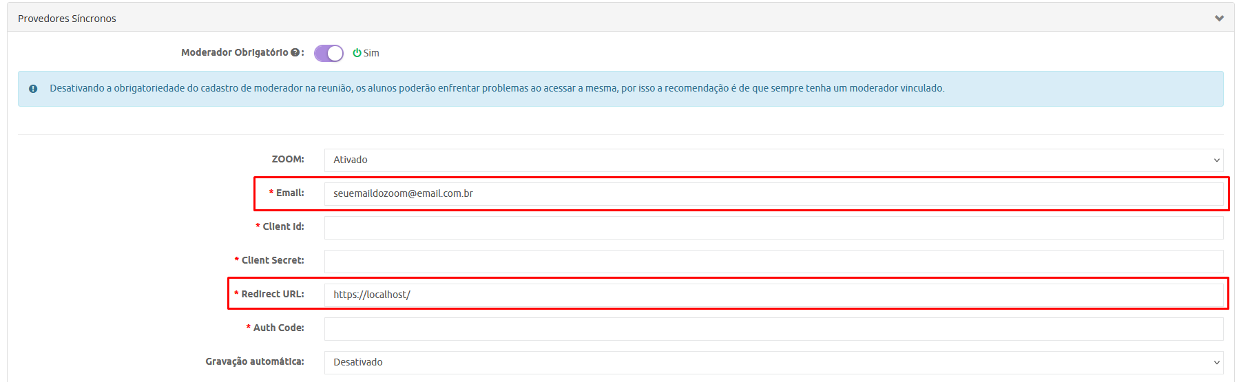 Clicar em Salvar e agora o ZOOM pode ser utilizado em reuniões como um provedor síncrono.
