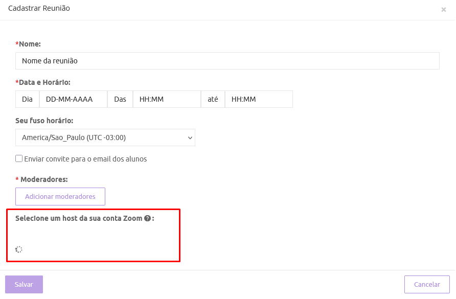 Ao cadastrar uma reunião na sua turma, você deverá selecionar o host da sua conta Zoom.