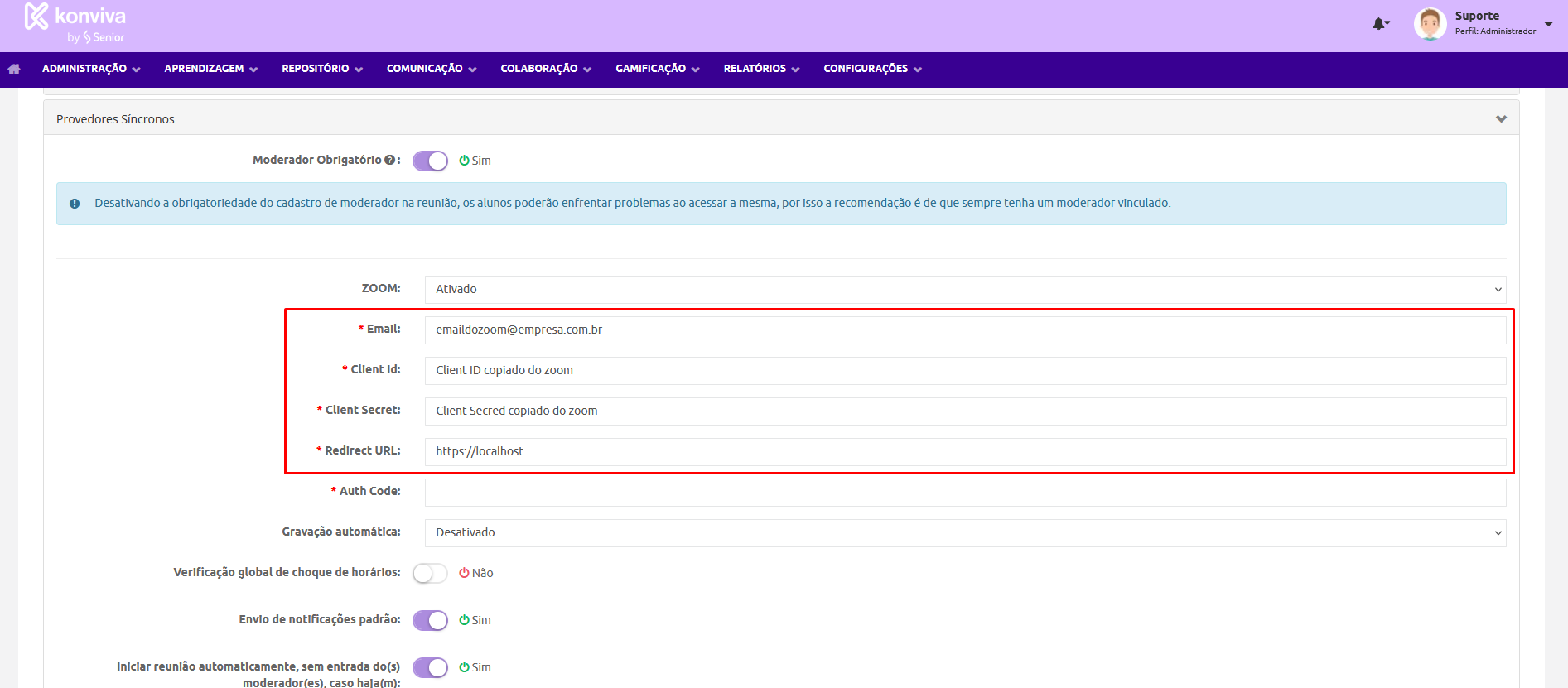 Para integrar o ZOOM na Konviva, é necessário realizar as configurações da integração, veja como realizar o procedimento abaixo.