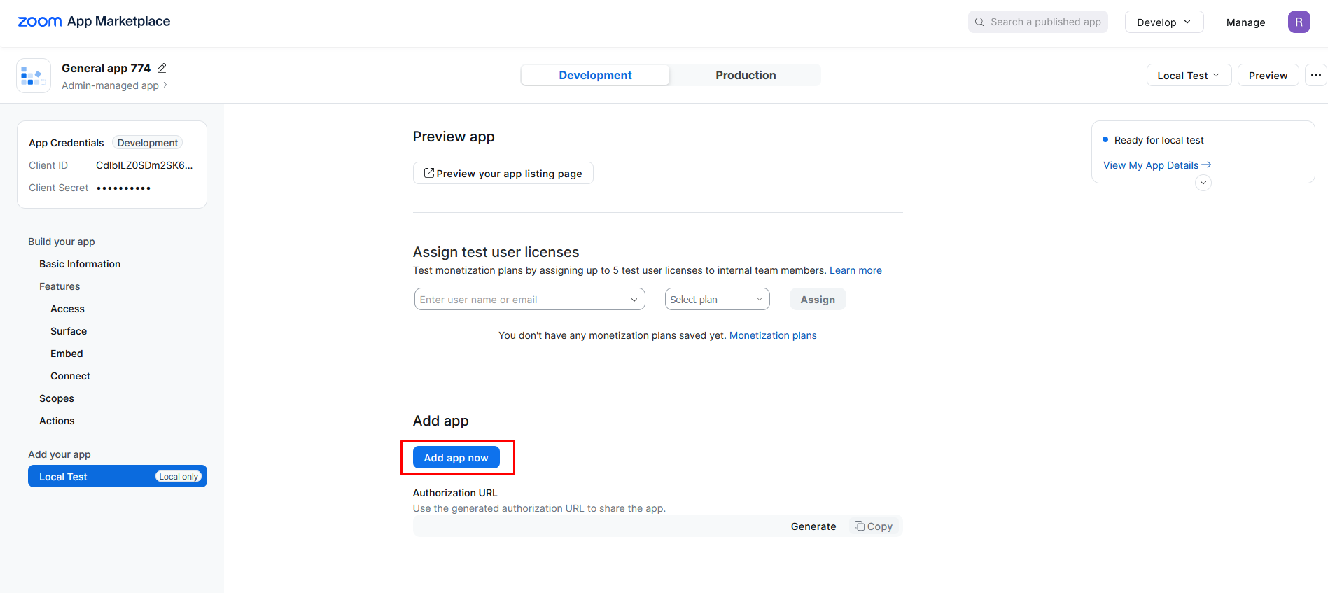 Agora você terá que ir até o menu "Add Your App" > "Local Test" conforme a imagem: