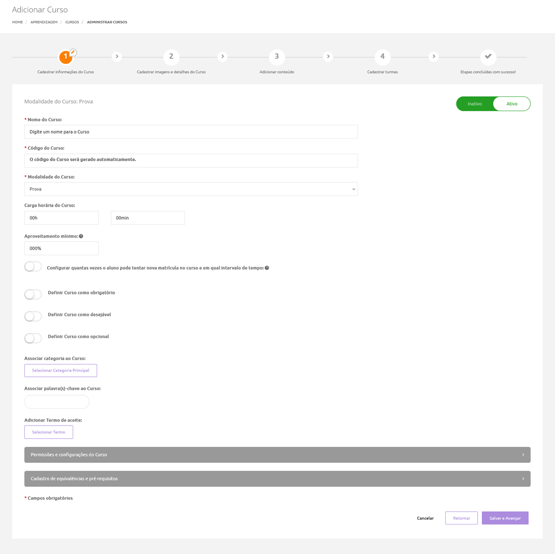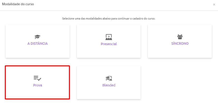 ATENÇÃO: quando realizamos a criação de um curso em uma modalidade "X", não é possível alterar para outra modalidade. Ex.: cadastrar um curso "prova" e alterar para "a distância" posteriormente.