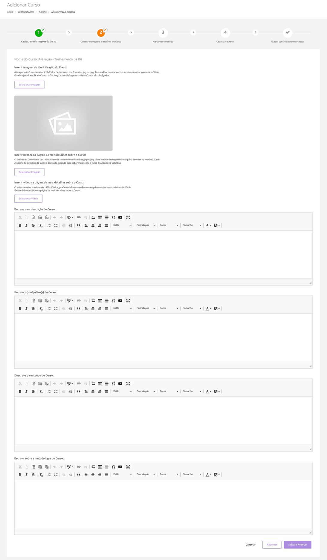 Nesta segunda etapa, você precisará inserir alguns elementos visuais para que seu curso seja exibido de forma atrativa e informativa para os alunos.