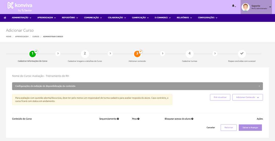 Nesta terceira etapa de cadastro de cursos, você precisará inserir as avaliações e os certificados para que os alunos possam visualizá-los.