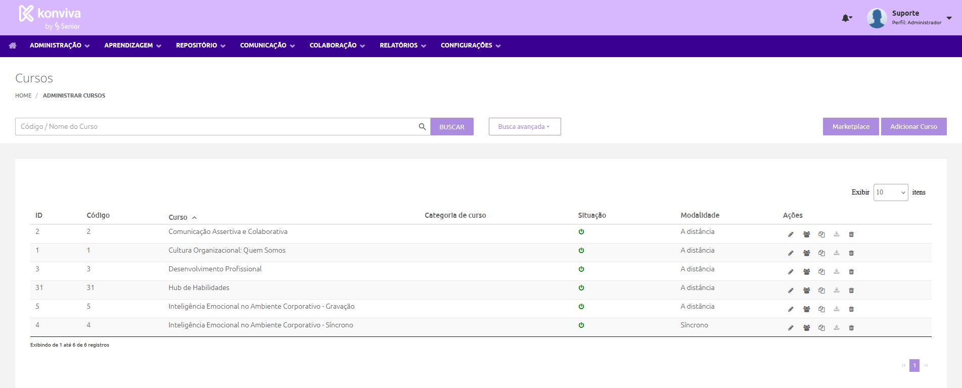 Para realizar o cadastro de um novo curso a distância no seu sistema, você pode acessar o menu Aprendizagem > Cursos > Administrar.Você terá acesso a todos os cursos cadastrados no seu ambiente.