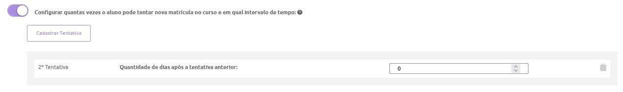 Ao clicar no botão "Cadastrar Tentativa" o sistema vai criando uma nova tentativa e você deverá configurar a quantidade de dias após a tentativa anterior o aluno poderá se matricular novamente. Caso não tenha nenhuma tentativa ou dias de tentativas configuradas, o aluno poderá se matricular na prova quantas vezes desejar. O número de tentativas da matrícula na prova é mostrado no Relatório de Certificação de Trilhas.