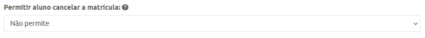 Permitir aluno cancelar a matrícula: Caso selecione "Não permite" o sistema não deixará o aluno cancelar a matrícula diretamente, em "Somente antes de iniciar a turma" permite que o aluno cancele a matricula somente quando a turma estiver com status "aguardando início", esta configuração é aplicável somente em turmas periódicas, e se selecionado "em qualquer momento" irá permitir o aluno cancelar a matrícula em qualquer momento da realização do curso.