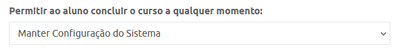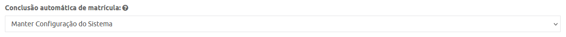 - 100% de andamento no conteúdo e status aprovado: significa que o aluno deverá ter navegado por todo o conteúdo e ter obtido aproveitamento suficiente para aprovar no curso. Somente quando atingir esta condição, o sistema concluirá o curso de forma automática. Caso o aluno não atenda este critério, o sistema concluirá o curso automaticamente quando a turma expirar.