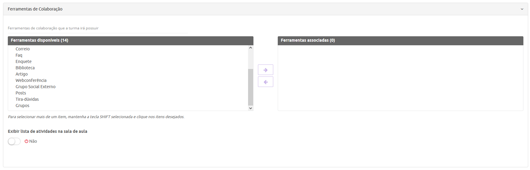 Ferramentas de colaboração: o administrador pode adicionar várias ferramentas de interação que serão habilitadas na sala de aula. Para saber mais a respeito delas, acesse aqui.