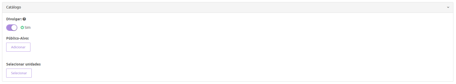 - Divulgar: Se habilitada, o botão para se matricular na turma será exibido no catálogo, calendário e trilha para aluno realizar matrícula, caso esta opção esteja inativa, o aluno não conseguirá se matricular na turma, ou seja, o aluno fica impossibilitado de realizar sua automatrícula.