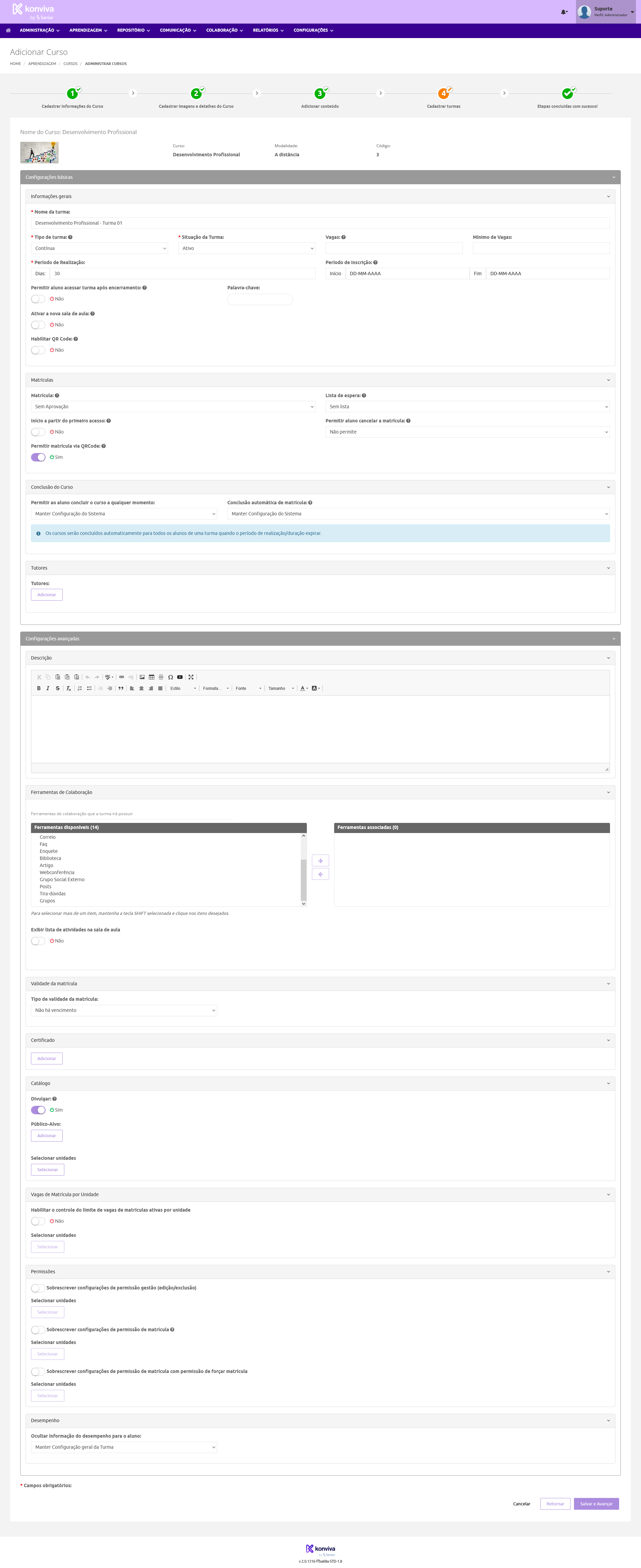 Agora basta clicar no botão "Salvar e Avançar" para salvar todas as suas configurações e prosseguir para a última etapa de criação de um curso a distancia: cadastro de turmas.