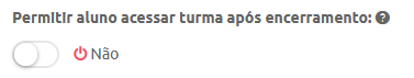 - Desativado: não irá ocorrer a conclusão automática da matricula, ou seja, a matricula do aluno será finalizada somente quando finalizar os dias configurados na turma contínua ou na data fim da turma periódica.