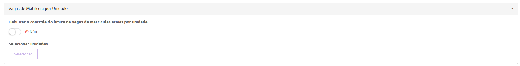 Vagas de matrícula por unidades: você pode limitar o número de matrículas para unidades específicas, para isso você deve habilitar o controle de limite de vagas, selecionar a unidade e informar o número de matrículas.