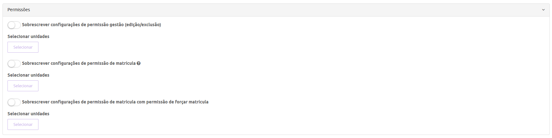 Permissões: você pode alterar as permissões padrões de um ou mais administrador(es) de unidade que terá(ão) acesso a esta turma, selecionando a unidade.