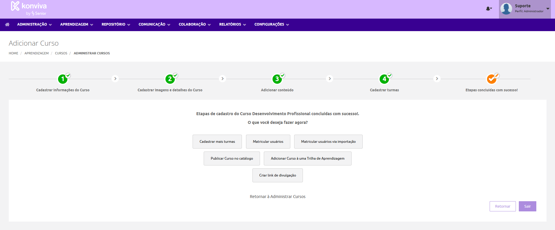 Para isso, nesta última tela disponibilizamos todos os recursos que você pode realizar com o seu curso criado como: