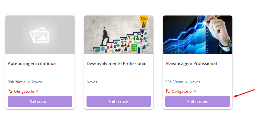 Passo 1: o gestor deve selecionar o curso o qual quer matricular usuários, e clicar em "saiba mais":