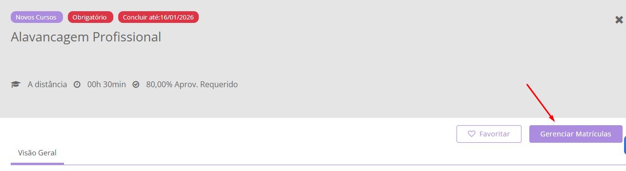 Passo 2: tendo clicado no curso escolhidos, abrirá a landing page com informações gerais sobre esse curso. O gestor deve clicar em "Gerenciar matrículas":