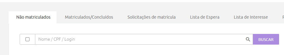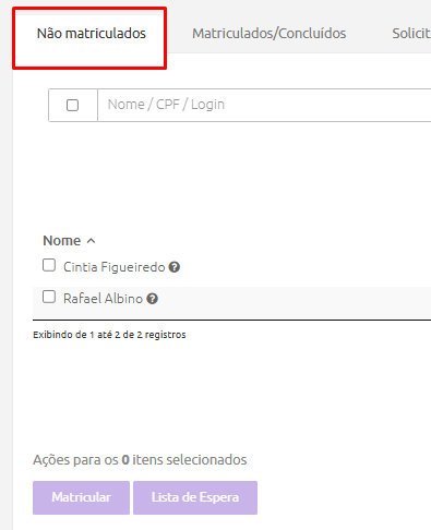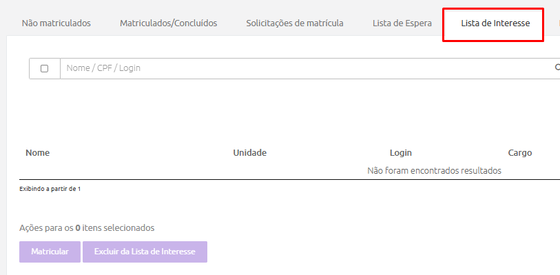 - O botão “Excluir da lista de interesse” permite retirar os alunos da lista de interesse. Os usuários excluídos da lista de interesse voltam a aparecer na aba “Não matriculados”.