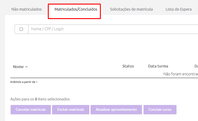 - O botão “Concluir curso” permite finalizar o curso dos alunos. Quando esta ação é executada o aluno muda o status de “Matriculado” para “Concluído”. Lembrando que caso o aluno não tenha ainda alcançado o aproveitamento mínimo solicitado no curso, ele será reprovado. Quando a matrícula do aluno é concluída na turma, o aluno volta a aparecer na lista de “Não matriculados”. O sistema pode enviar e-mail automático de conclusão de curso, caso configurado no menu Comunicação > Notificações de sistema.
