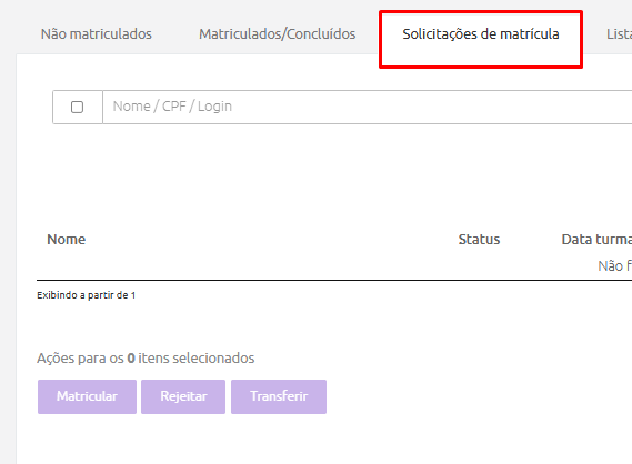 - São listados todos os usuários com perfil “aluno” das unidades do gestor, com situação “ativo” ou “inativo” que solicitou matrícula na turma. Essa aba é utilizada quando habilita-se a configuração existente em turma que as matrículas devem ser "com aprovação", e então a listagem dos alunos que fazem a solicitação da matrícula aparece nessa tela.