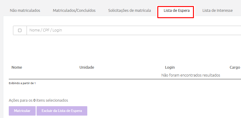- São listados todos os usuários com perfil “aluno” das unidades do gestor, com situação “ativo” ou “inativo” que clicaram no botão “Lista de Espera” em cursos que estão no Catálogo e não possuem mais vagas disponíveis ou que foram enviados para a lista manualmente pelo administrador ou gestor. O sistema pode enviar e-mail automático de envio para a lista de espera, caso configurado no menu Comunicação > Notificações de sistema.