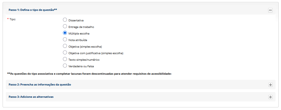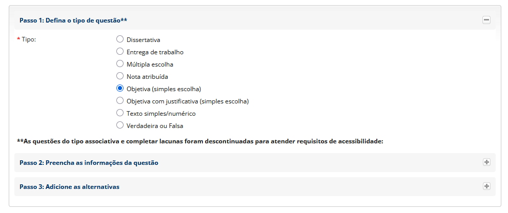 Abaixo segue como cadastrar cada um dos tipos de questão: