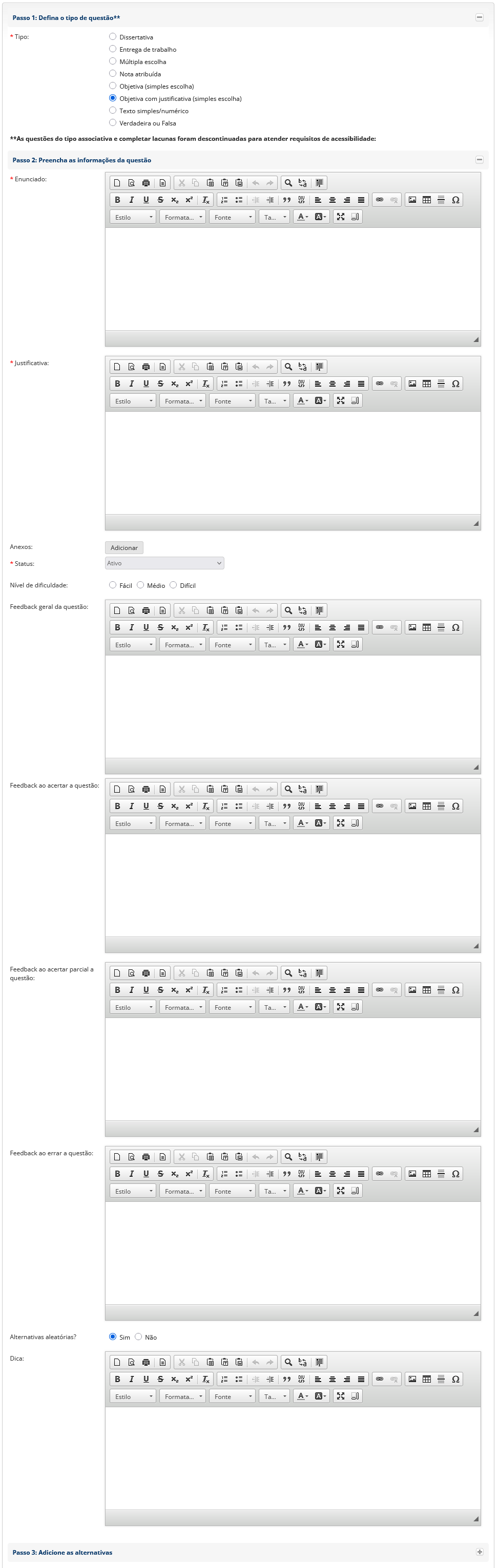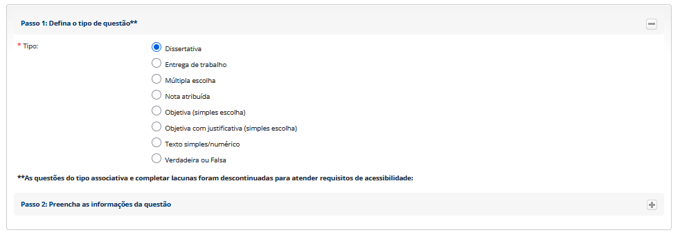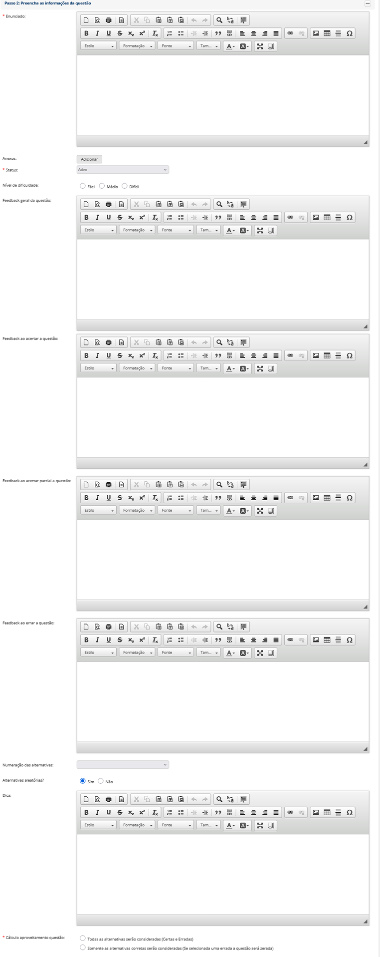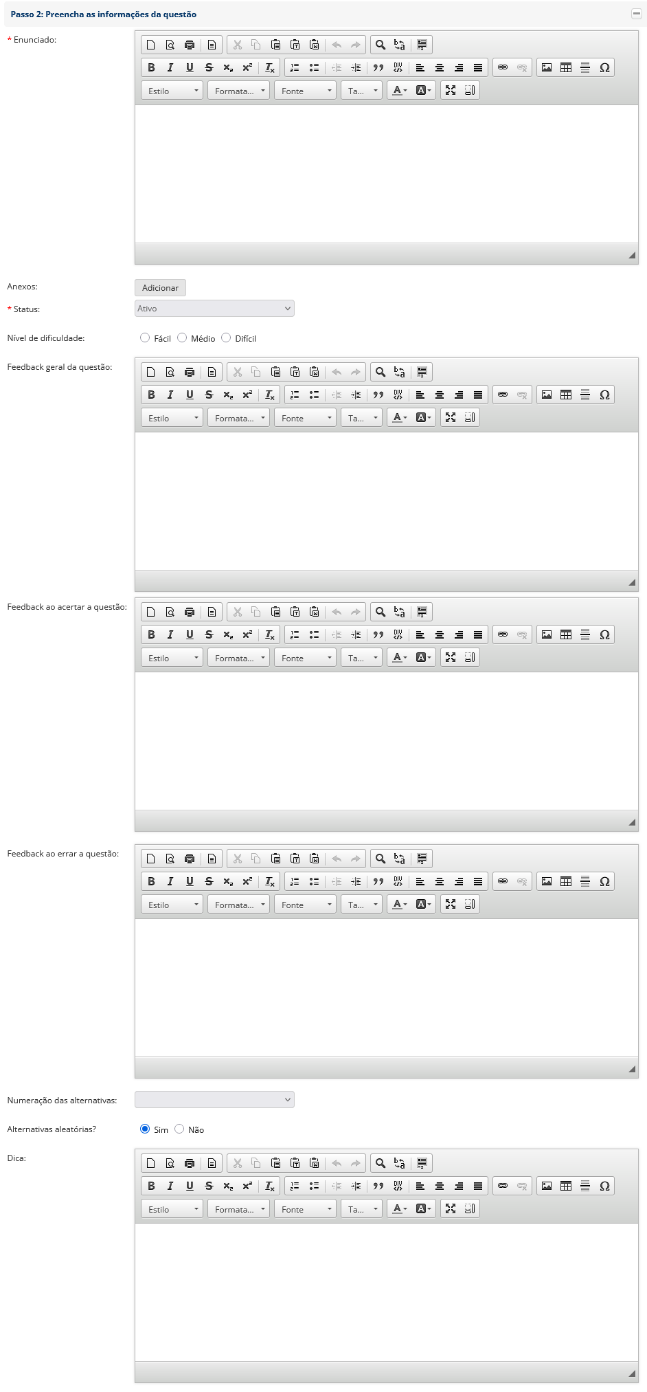 Passo 2 - preencher as informações da questão. Clique no botão "+" para expandir, e visualizar as informações a serem preenchidas: