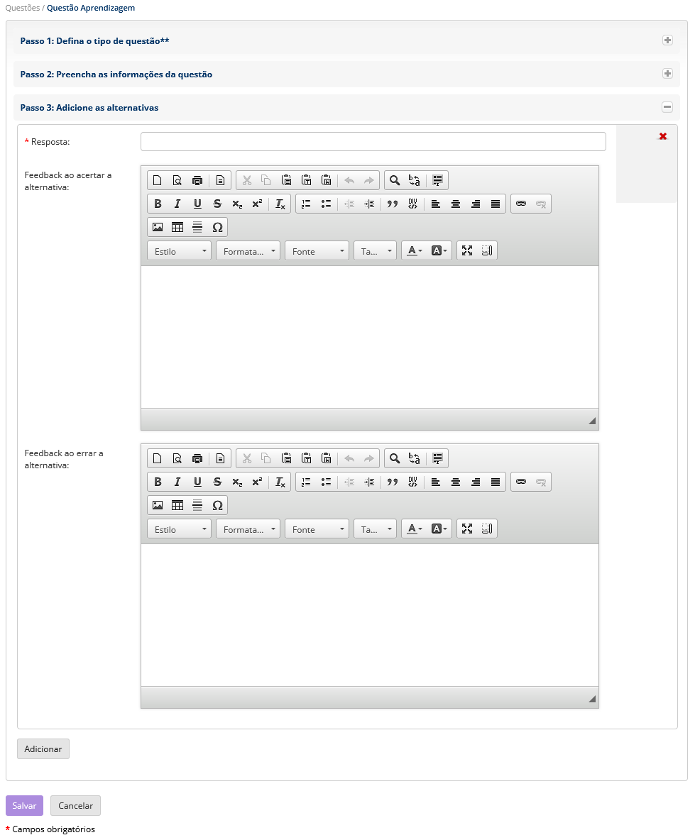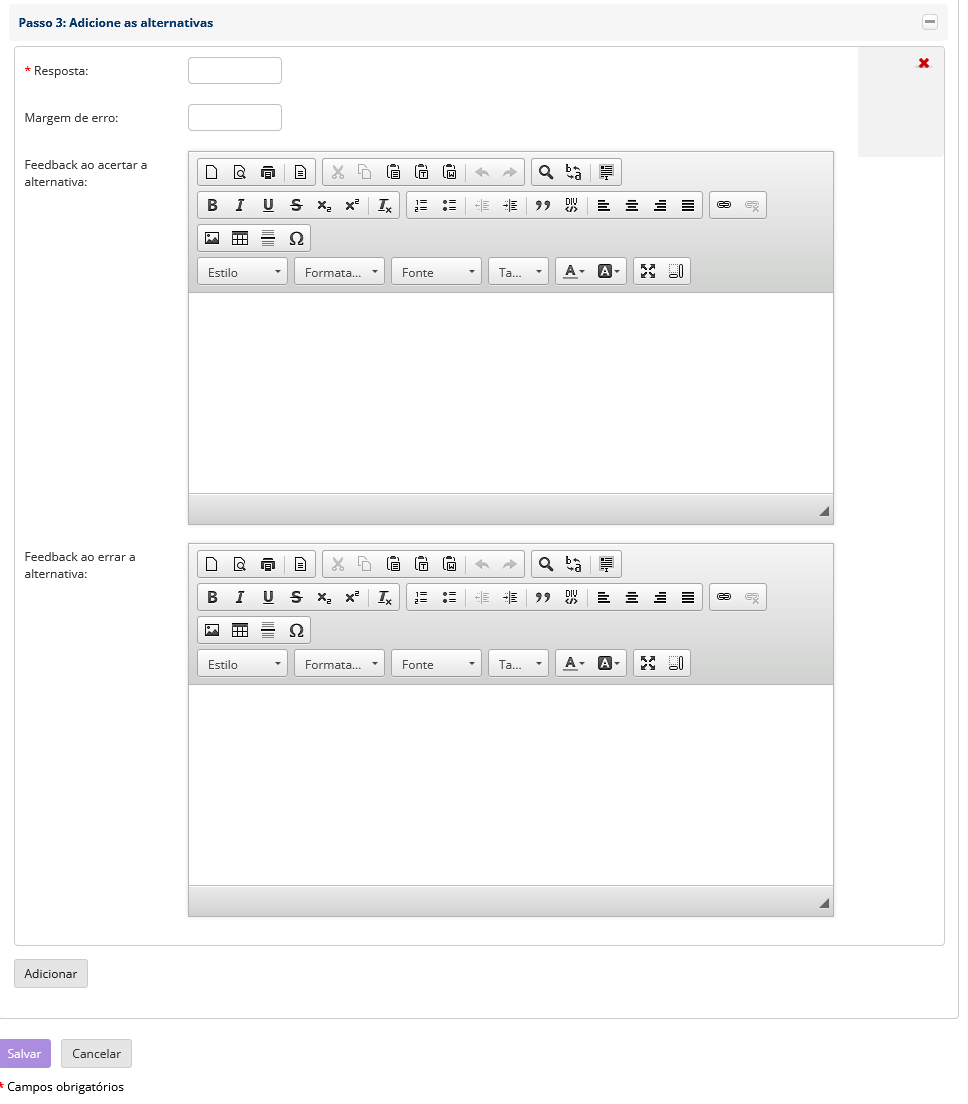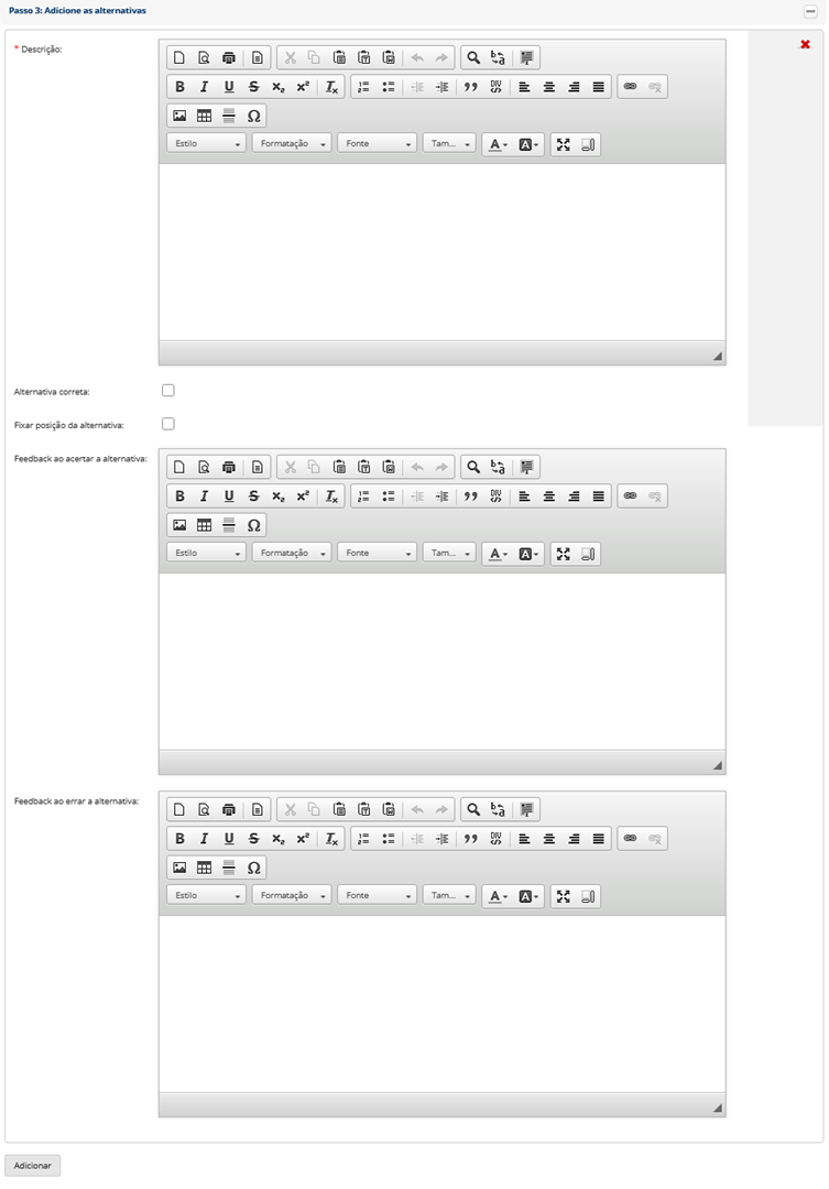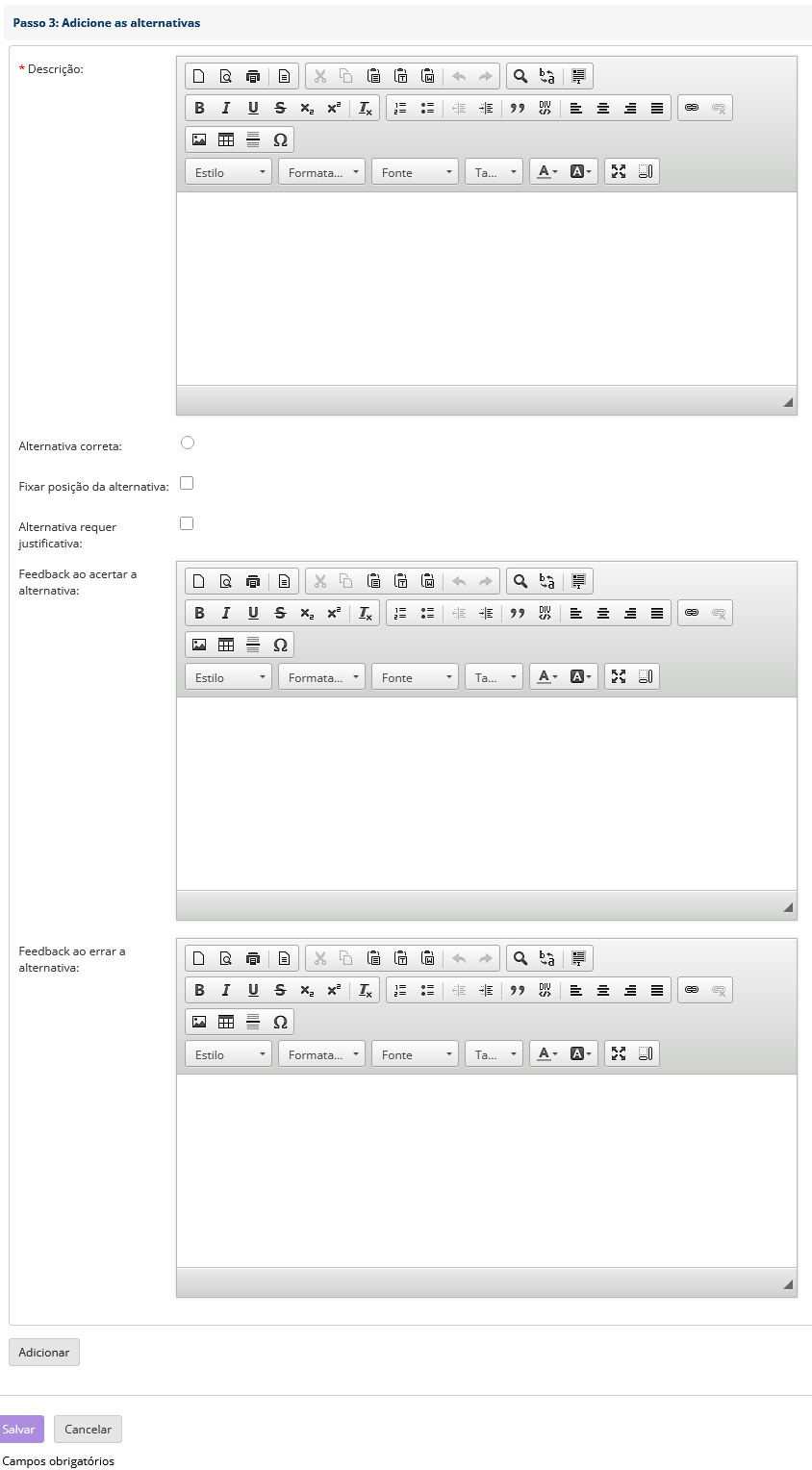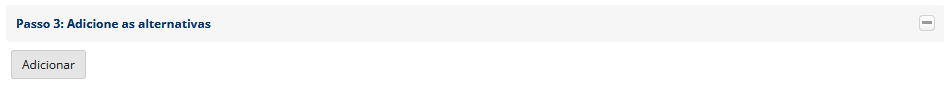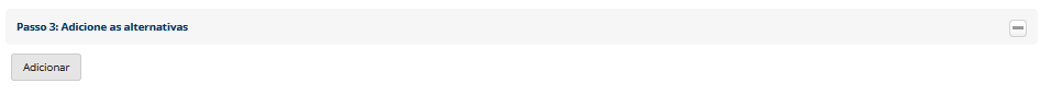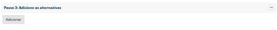 Para ambos os tipos, caso haja a necessidade, é possível cadastrar mais alternativas, clicando no botão "Adicionar" que aparece na parte mais inferior.