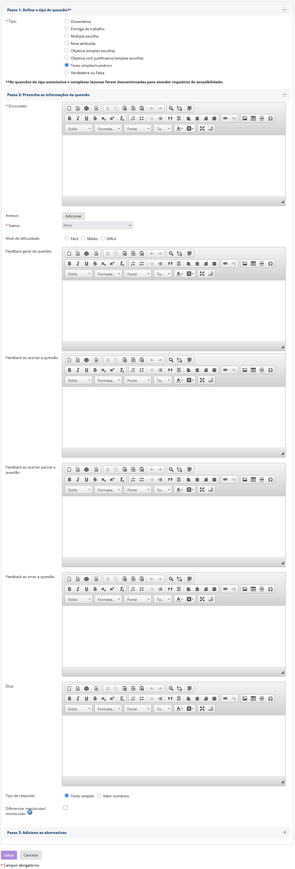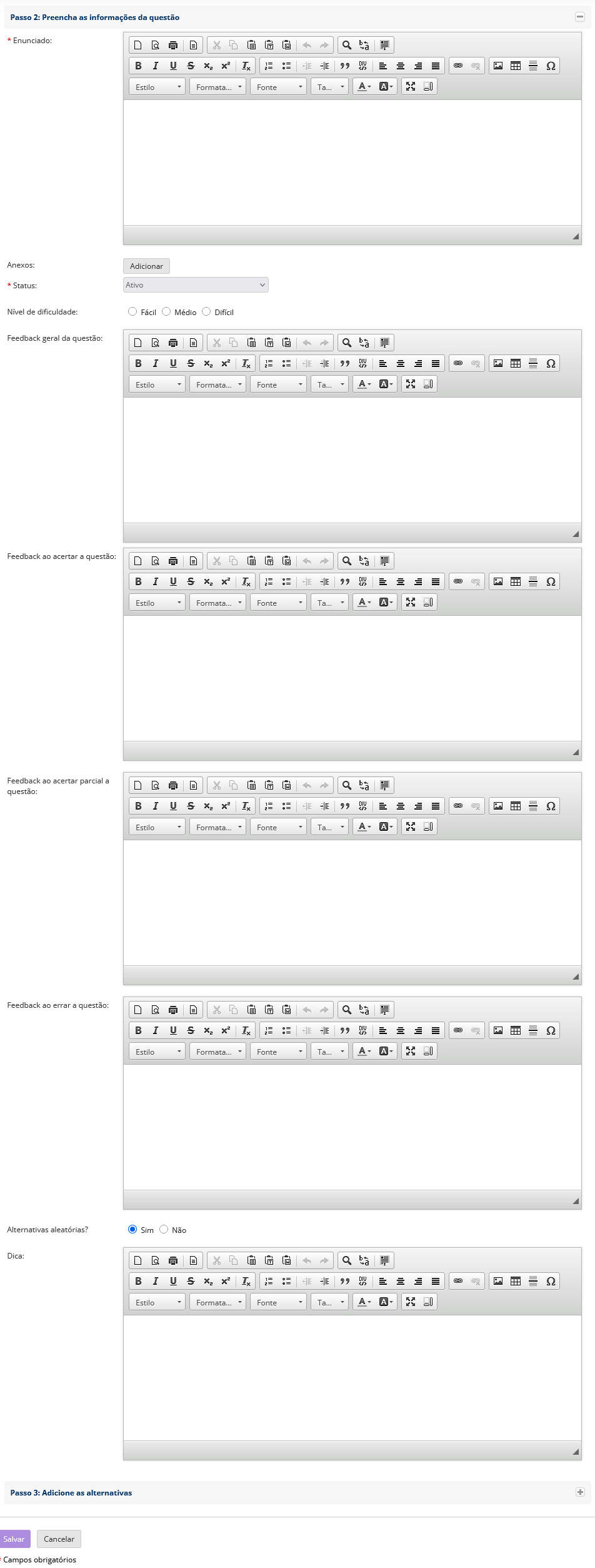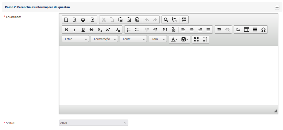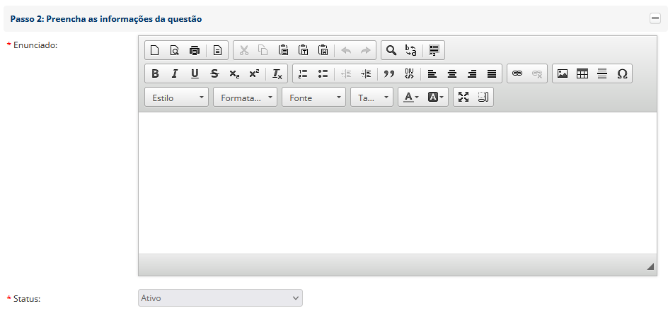 Preencha o enunciado da questão e o status (ativo ou inativo - apenas questões ativas poderão ser inseridas em avaliações), e salve.