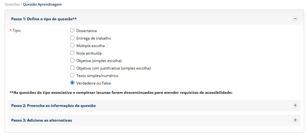 Passo 1: selecione a opção "verdadeiro ou falso".