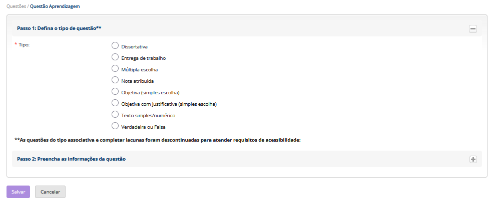 Lembrando que para cadastrar uma questão, você deve ir em Menu Repositório > Avaliações > Banco de questões. Na tela que abrirá, você deve criar uma nova categoria (novo banco de questões) ou selecionar um já existente, clicar na caixa de seleção "Adicionar" e escolher "Questão de aprendizagem", onde essa seleção abrirá a seguinte tela: