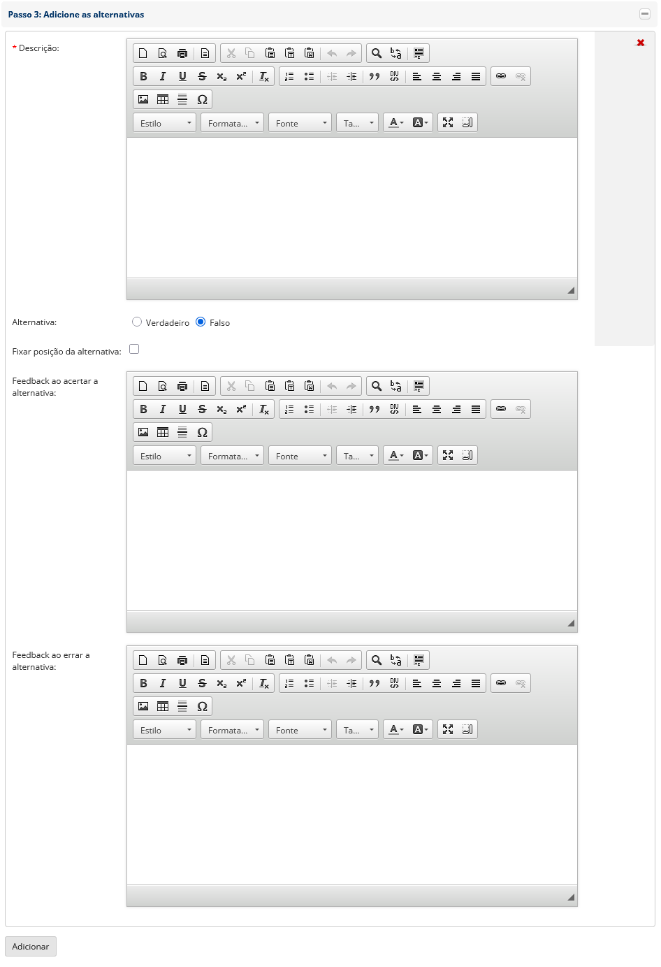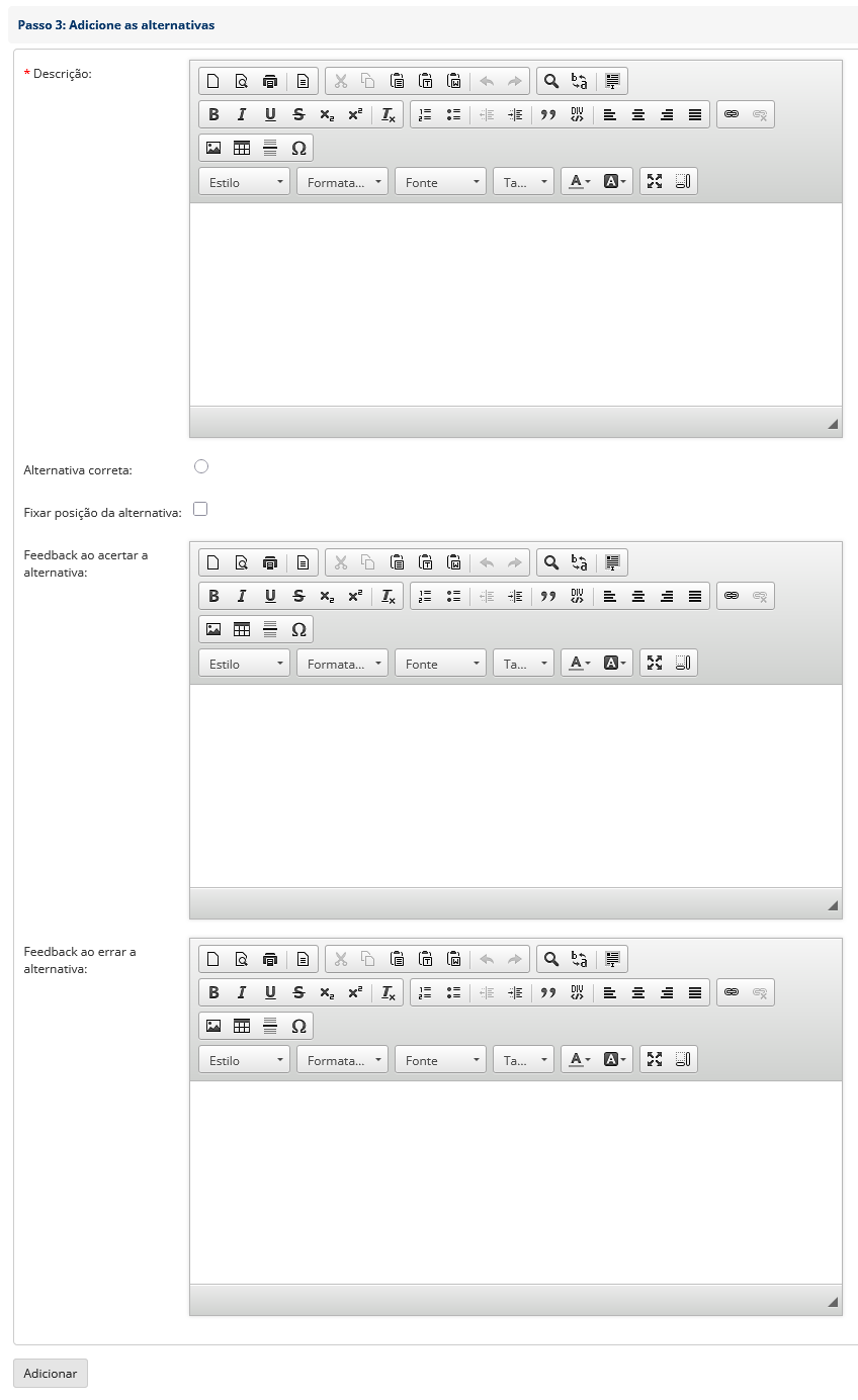 Para adicionar mais alternativas, basta clicar no botão "adicionar", e os mesmos campos serão mostrados novamente.