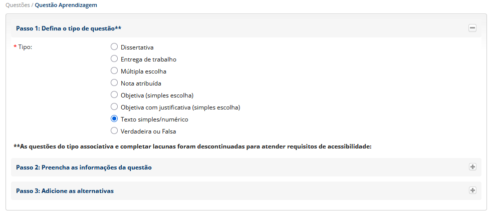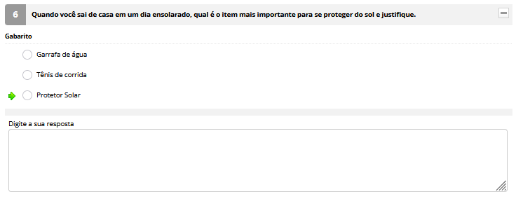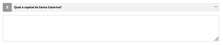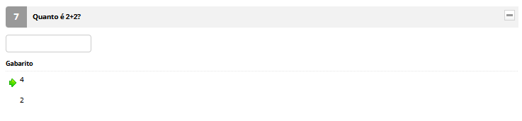 Permite cadastrar expressão ou número que precisar ser inserido pelo aluno como resposta. Apesar de ser dada a resposta por escrito pelo aluno, ela é objetiva, fazendo com que haja a possibilidade de sua correção ser automática.