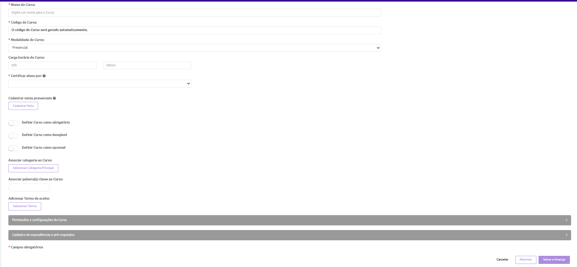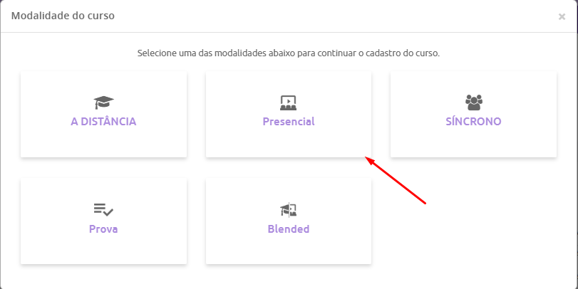 ATENÇÃO: quando realizamos a criação de um curso em uma modalidade "X", não é possível alterar para outra modalidade. Ex.: cadastrar um curso "presencial" e alterar para "síncrono" posteriormente.