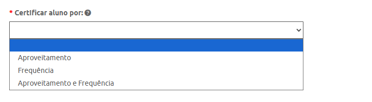 Certificar o aluno por: neste campo, o administrador deve escolher a forma como os alunos serão aprovados no final do curso. As opções incluem "Aproveitamento ", "Frequência" e "Aproveitamento e Frequência".