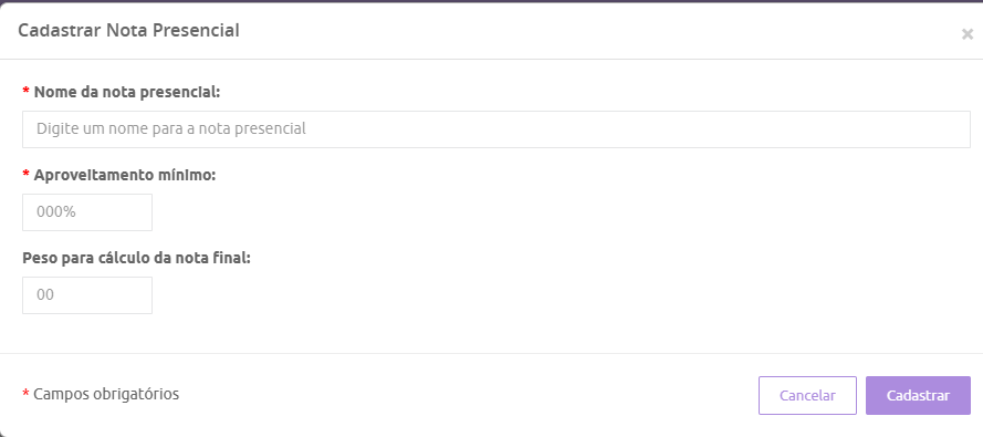 Notas presenciais: permite que o criador do curso acrescente outros critérios para compor a nota final do aluno, onde caberá ao instrutor o preenchimento das notas dos participantes referentes às notas presenciais.