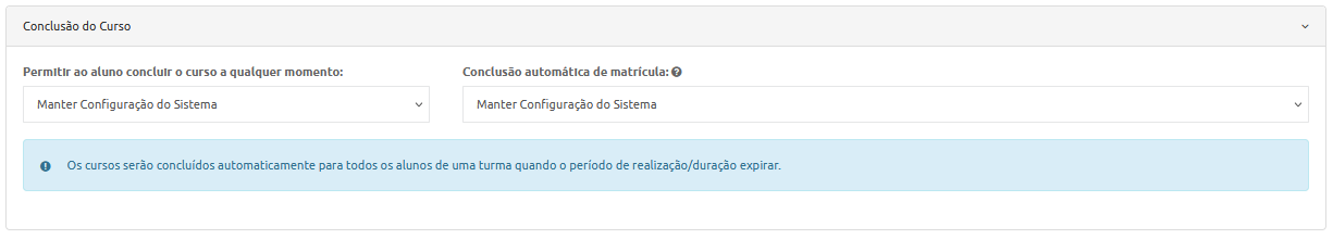 - 100% de andamento no conteúdo e status aprovado: significa que o aluno deverá ter navegado por todo o conteúdo e ter obtido aproveitamento suficiente para aprovar no curso. Somente quando atingir esta condição, o sistema concluirá o curso de forma automática. Caso o aluno não atenda este critério, o sistema concluirá o curso automaticamente quando a turma expirar.