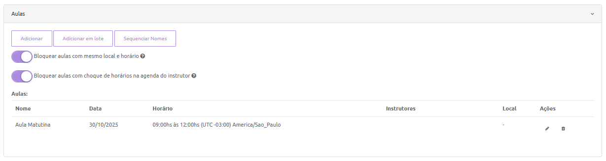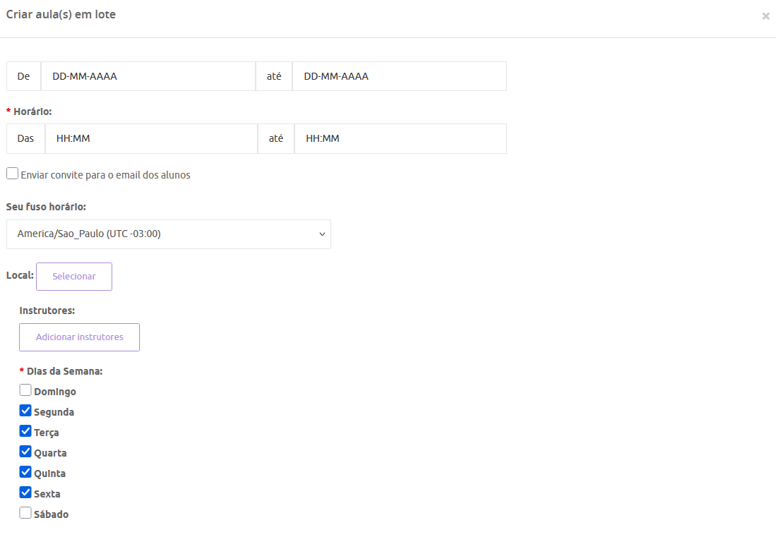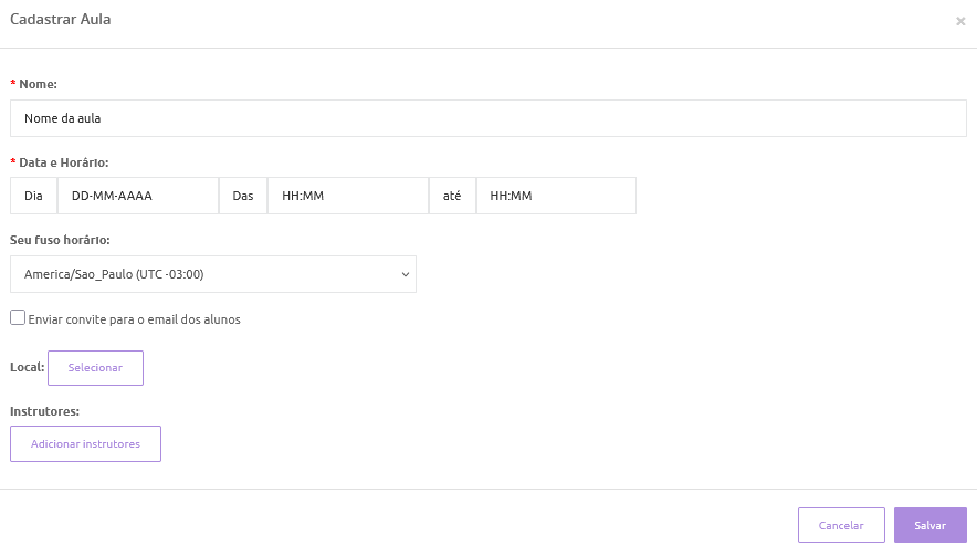 Local: deve ser selecionado o Local onde irá acontecer a aula.
