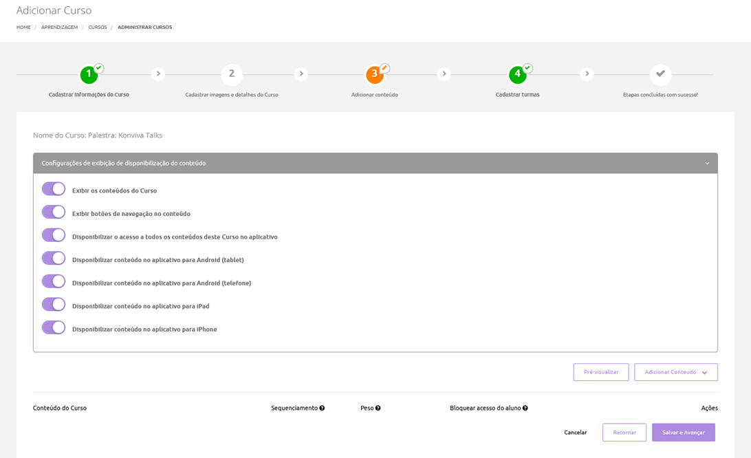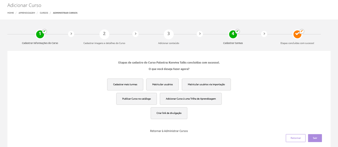 Para isso, nesta última tela disponibilizamos todos os recursos que você pode realizar com o seu curso criado, como: