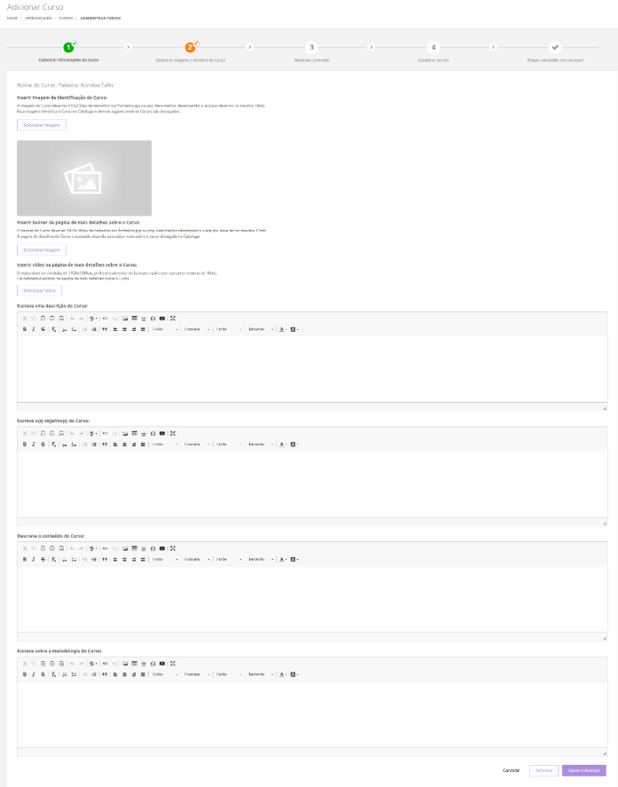 Nesta segunda etapa, você precisará inserir alguns elementos visuais para que seu curso seja exibido de forma atrativa e informativa para os alunos.